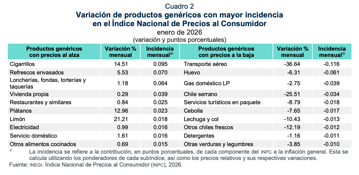 Los precios de los bienes y servicios más significativos por su incidencia sobre la inflación general durante el mes de enero de 2026 fueron, al alza: Cigarrillos; Refrescos envasados; Loncherías, fondas, torterías y taquerías; Vivienda propia; Restaurantes y similares; Plátanos; Limón; Electricidad; Servicio doméstico y Otros alimentos cocinados. Así como a la baja: Transporte aéreo; Huevo; Gas doméstico LP; Chile serrano; Servicios turísticos en paquete; Cebolla; Lechuga y col; Otros chiles frescos; Detergentes y Otras verduras y legumbres.