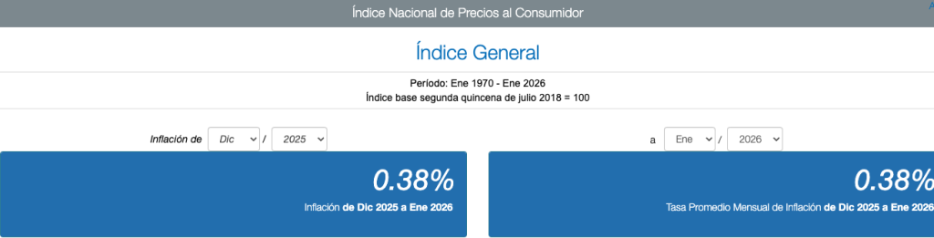 Inflación al mes de ENERO 2026 es de 0.38%, INPC 143.588, DOF 10/02/2026.