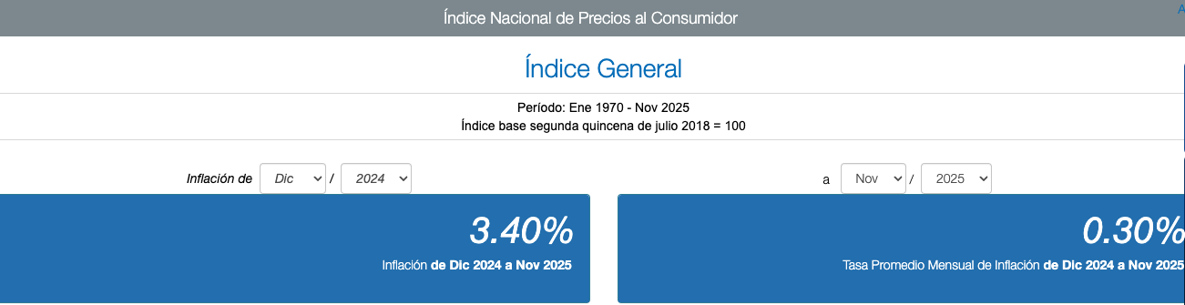 Inflación al mes de NOVIEMBRE 2025 es de 3.40%, INPC 142.645, DOF 10/12/2025.