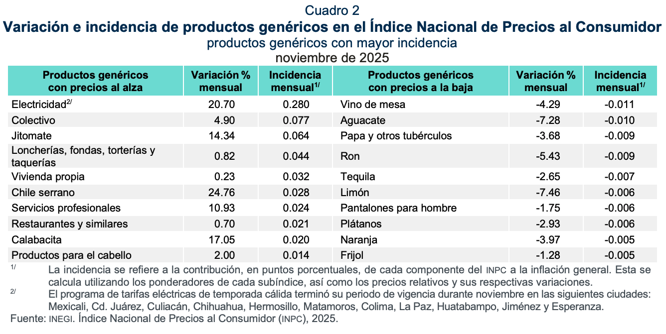 Los precios de los bienes y servicios más significativos por su incidencia sobre la inflación general durante el mes de noviembre de 2025 fueron, al alza: Electricidad; Colectivo; Jitomate; Loncherías, fondas, torterías y taquerías; Vivienda propia; Chile serrano; Servicios profesionales; Restaurantes y similares; Calabacita; y Productos para el cabello. Así como a la baja: Vino de mesa; Aguacate; Papa y otros tubérculos; Ron; Tequila; Limón; Pantalones para hombre; Plátanos; Naranja y Frijol.