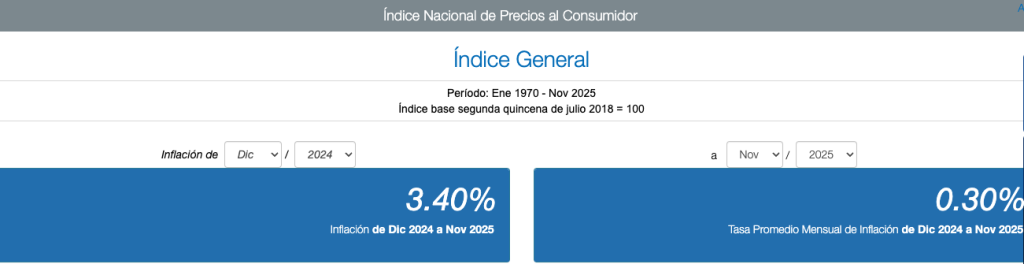 Inflación al mes de NOVIEMBRE 2025 es de 3.40%, INPC 142.645, DOF 10/12/2025.
