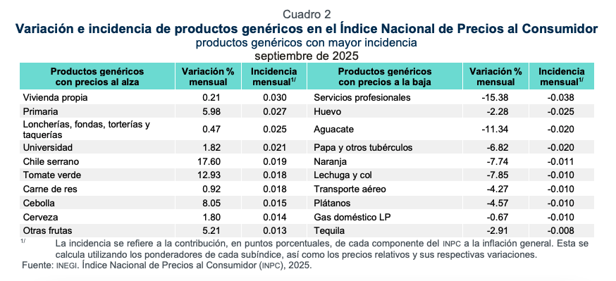 Los precios de los bienes y servicios más significativos por su incidencia sobre la inflación general durante el mes de septiembre de 2025 fueron, al alza: Vivienda propia; Primaria; Loncherías, fondas, torterías y taquerías; Universidad; Chile serrano; Tomate verde; Carne de res; Cebolla; Cerveza; y Otras frutas. Así como a la baja: Servicios profesionales; Huevo; Aguacate; Papa y otros tubérculos; Naranja; Lechuga y col; Transporte aéreo; Plátanos; Gas doméstico LP y Tequila.